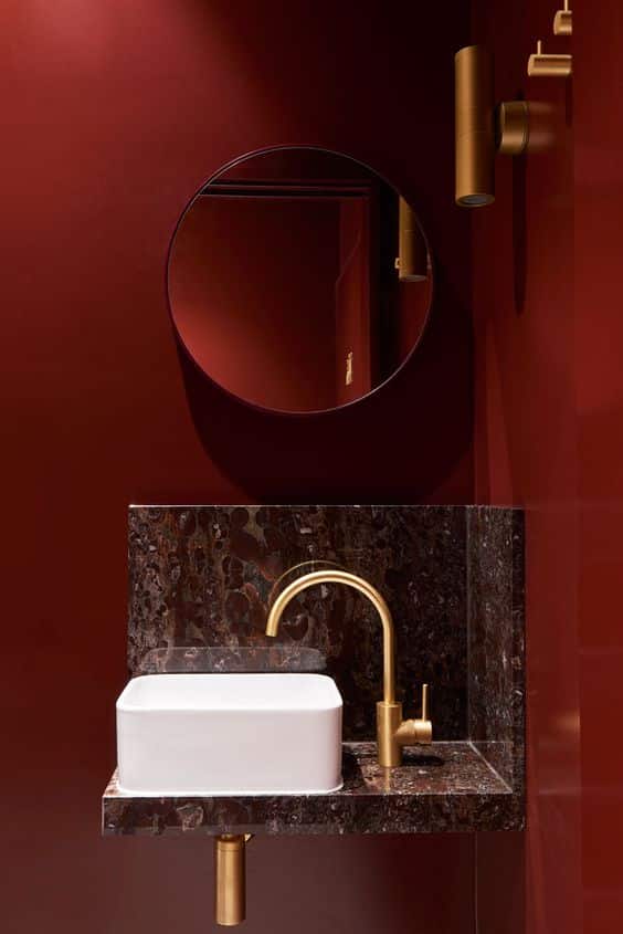 Une couleur rouge pour une atmosphère chaleureuse et sophistiquée dans cette salle d’eau.