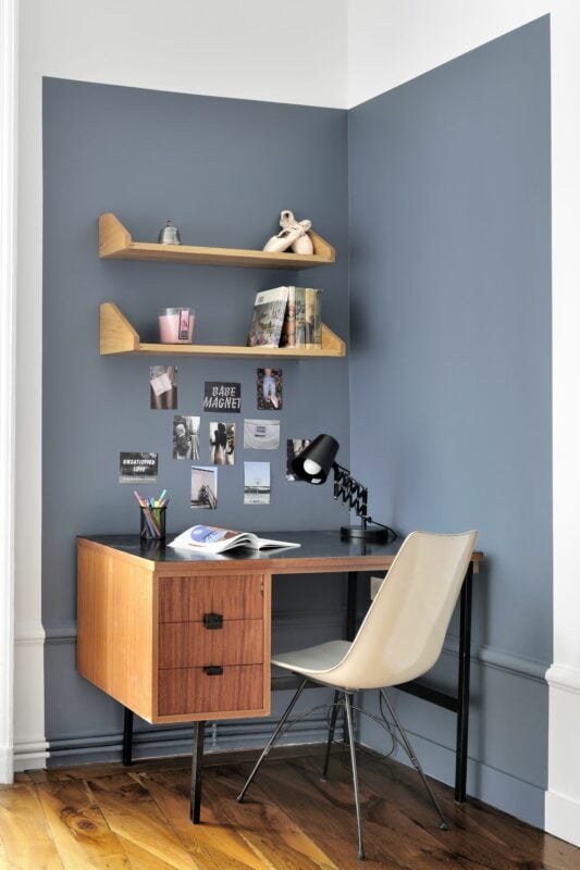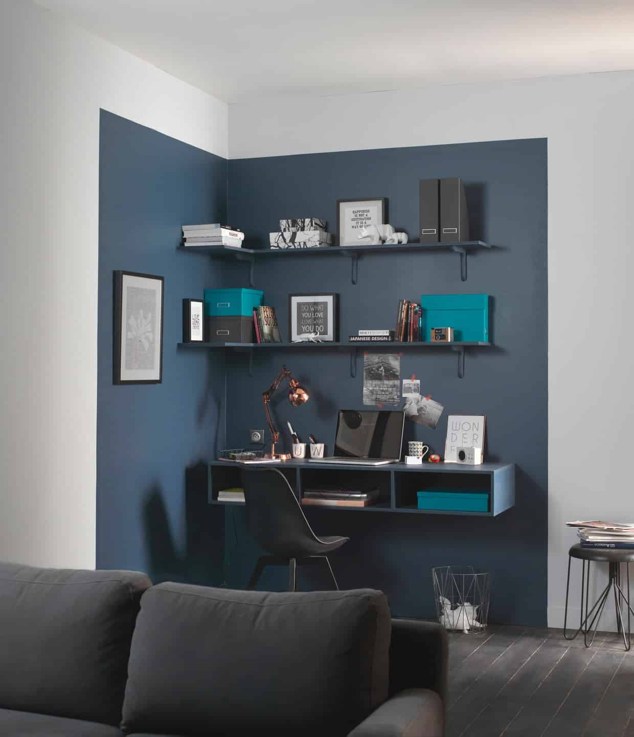 Comme vous pouvez le voir sur les images ci-dessous, la peinture permet de délimiter votre espace bureau du reste de la pièce. Par conséquent, aucuns travaux n’est nécessaire. Il vous suffit d’acheter un pot de peinture de la couleur de votre choix. Si vous n’êtes pas bricoleur, vous pouvez aussi demander à Monsieur Peinture de s’en charger. Nous proposons un forfait mur de couleur avec un peintre professionnel qui vient chez vous.