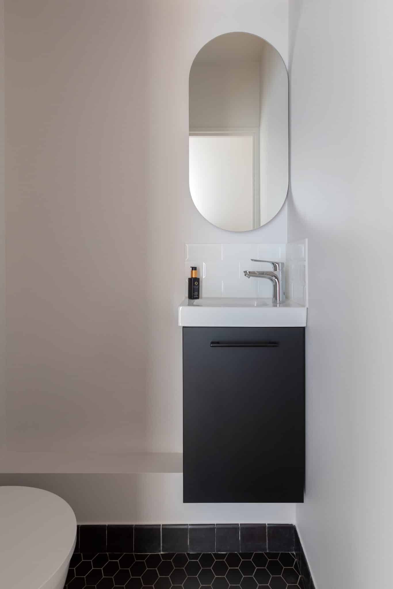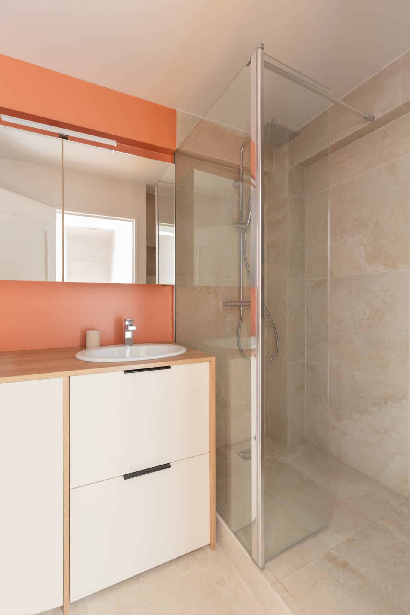 Rénovation complète d’un 60 m² en plein Paris par Monsieur Peinture : peinture, cuisine, salle de bains, fenêtres, isolation, sol. Des couleurs audacieuses validées avec notre coloriste.
