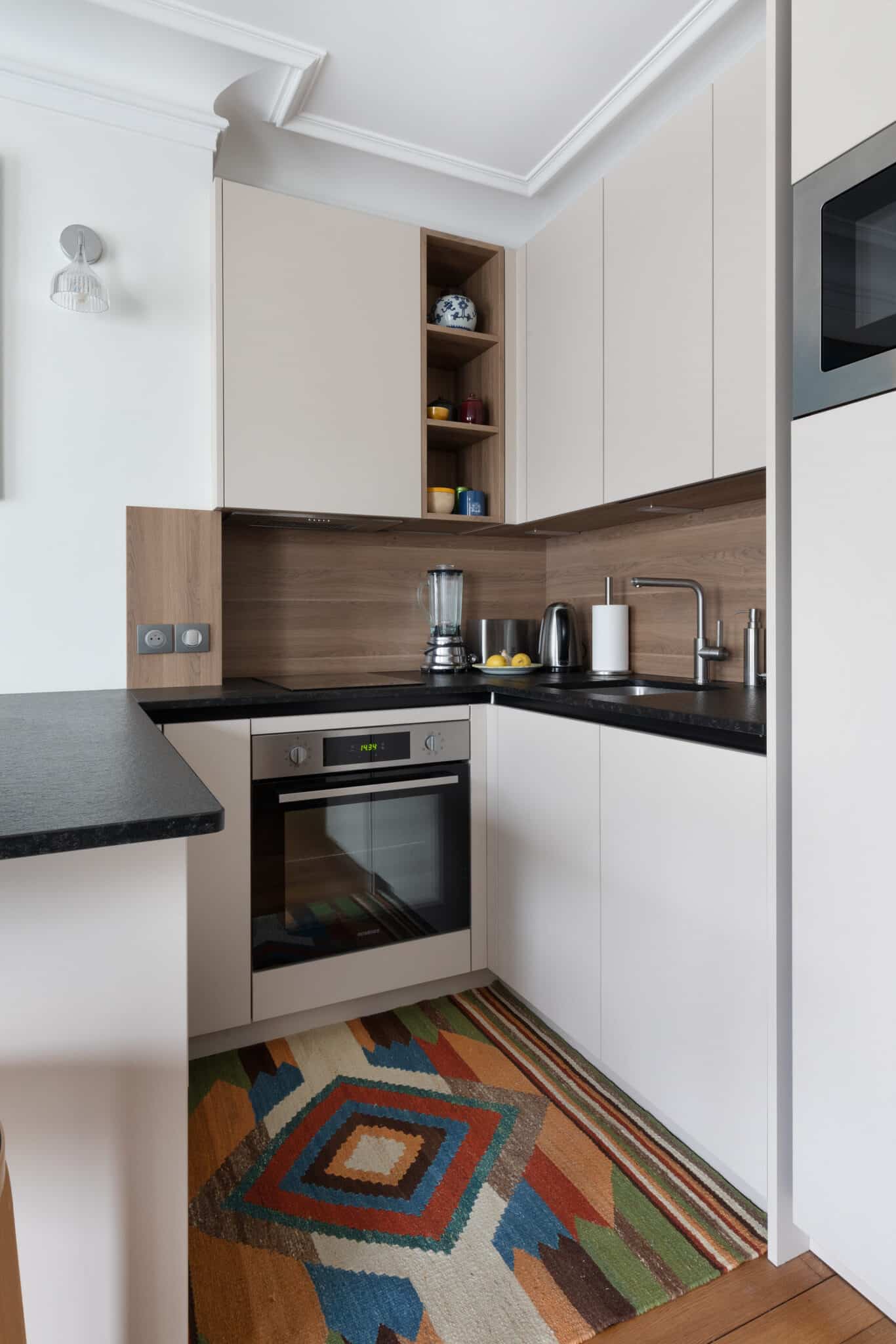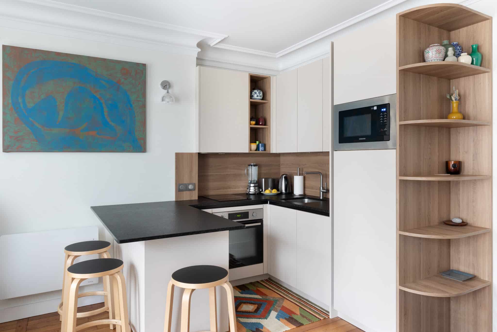 Rénovation globale Paris. Un appartement de 40 m² revisité par Monsieur Peinture pour un intérieur ouvert, chaleureux et contemporain.